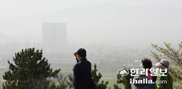 30일 제주시 도두봉 정상에 오른 시민들이 황사와 미세먼지에 뒤덮인 제주시가지를 보고 있다. 이상국기자