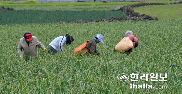 31일 서귀포시 대정읍 신도리 한 밭에서 농민들이 마늘종을 뽑고 있다. 강희만기자