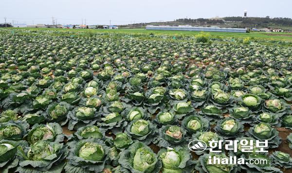 최근 양배추 가격이 폭락한 가운데 31일 제주시 한경면 고산리 농경지에 수확을 포기한 양배추에 싹이 나오면서 안타까운 모습을 보여 주고 있다. 강희만기자