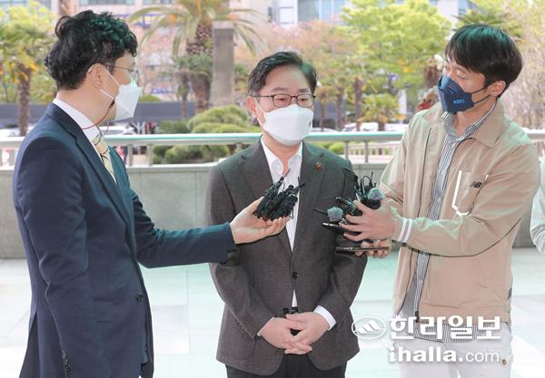 박 장관은 2일 제주지방검찰청 앞에서 기자들의 질문에 대답하고 있다.