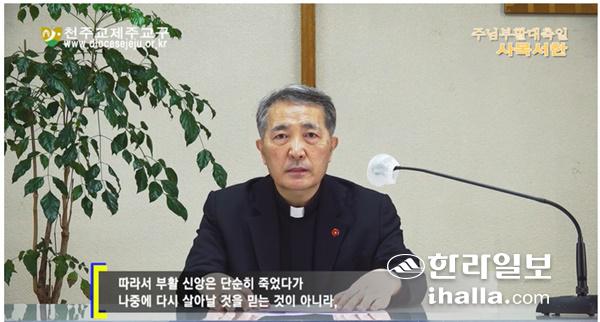 천주교제주교구장인 문창우 주교가 동영상 채널을 이용해 부활 대축일 사목서한을 발표하고 있다.