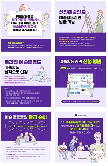 신진 예술인도 예술활동증명을 발급받을 수 있다. 문화체육관광부는 더욱 많은 예술인들이 예술인복지제도에 참여할 수 있도록 '예술인 복지법 시행규칙'과 '예술 활동 증명 운영 지침'(예규)의 예술활동증명 심의 기준을 개정해 시행한다고 밝혔다.