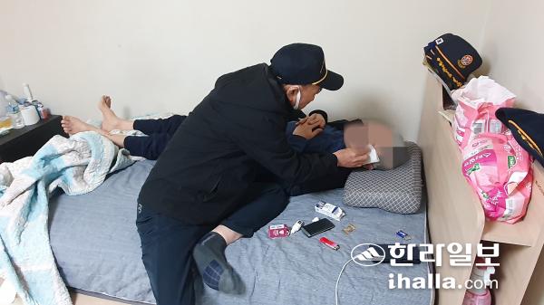 월남참전용사 강문종씨 집에 방문해 안약을 넣어주고 있는 송용해씨. 강민성기자