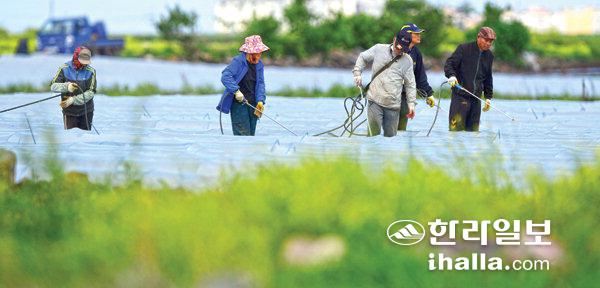 5일 서귀포시 대정읍 하모리 농경지에서 농민들이 농약 살포작업을 하고 있다. 강희만기자