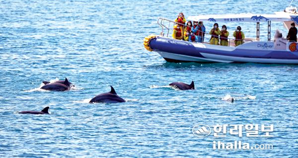화창한 날씨를 보인 5일 서귀포시 대정읍 앞바다에서 남방큰돌고래 무리가 돌고래 탐사 관광선 앞을 지나고 있다. 강희만기자