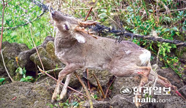 4일 서귀포시 성산읍 난산리 한 농경지 울타리 그물에 뿔이 걸린 숫노루가 빠져나오려고 몸부림을 치고있다. 노루는 한국조류보호협회 제주도지회 회원들에 의해 무사히 구조됐다. 강희만기자
