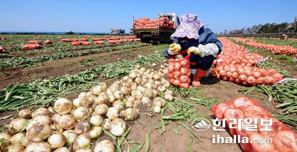 6일 서귀포시 대정읍 한 밭에서 농민들이 햇양파를 수확하고 있다. 이상국기자