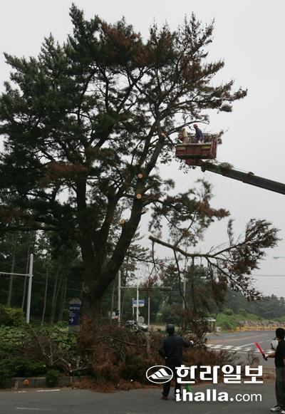 문제는 존치 결정 직후 일어났다. 누군가가 소나무 밑동에 구멍을 뚫어 농약을 투입하는 사건이 발생한 것이다. 결국 소나무는 농약의 독성을 이기지 못하고 2007년 말라죽었다. 당시 제주시는 현상금까지 걸며 농약을 살포한 범인 색출에 나섰지만 아직도 범인은 잡히지 않았다.
