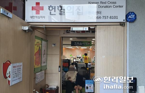 9일 현혈의집 한라센터에 대학생들이 찾아와 지정헌혈을 하고 있다. 사진은 헌혈의집 한라센터 입구.