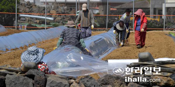 11일 제주시 한경면 두모리 한 농경지에서 농민들이 종자 파종후 비닐씌우기 작업을 하고 있다. 강희만기자