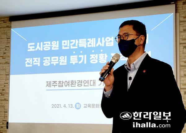 13일 제주참여환경연대 홍영철 대표가 제주시 이도2동 교육문화카페 '자람'에서 최근 논란이 일고 있는 도시공원 민간특례사업 부지에 전직 공무원의 투기 정황이 포착됐다는 내용의 기자회견을 하고 있다. 연합뉴스