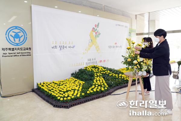 제주도교육청이 15일부터 25일까지 '세월호 7주기 추모 주간'을 갖는다. 도교육청은 이 기간 본청 1층 로비 등에 추모 현수막을 게시하고 노란리본이 달린 화분을 비치해 세월호의 아픔·교훈을 함께 추모하고 기억한다. 사진=제주특별자치도교육청 제공