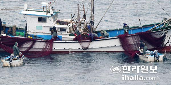 입맛 돋우는 자리돔 어획17일 국토 최남단 마라도 인근 해상에서 봄철 제주인들의 입맛을 돋우는 자리돔을 잡는 어부들이 그물을 끌어 올리고 있다. 강희만기자