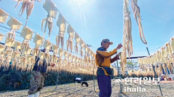 19일 제주시 한경면 고산리 주택가에서 한 주민이 따사로운 봄볕에 오징어 말리기 작업을 하고 있다. 강희만기자