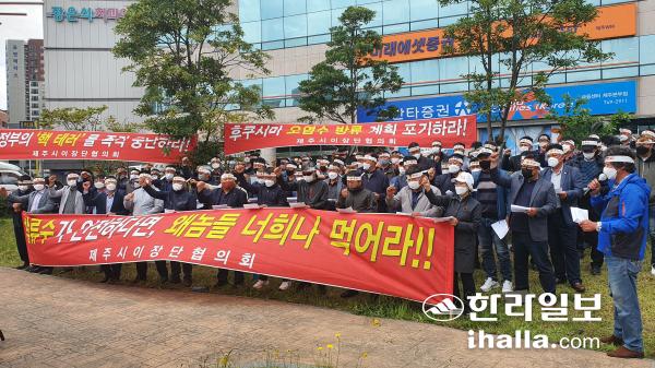 제주시이장협의회가 23일 제주시 노형동 주제주일본국총영사관 앞에서 기자회견을 열고 후쿠시마 방사능 오염수 해양방류 결정 철회 구호를 외치고 있다.