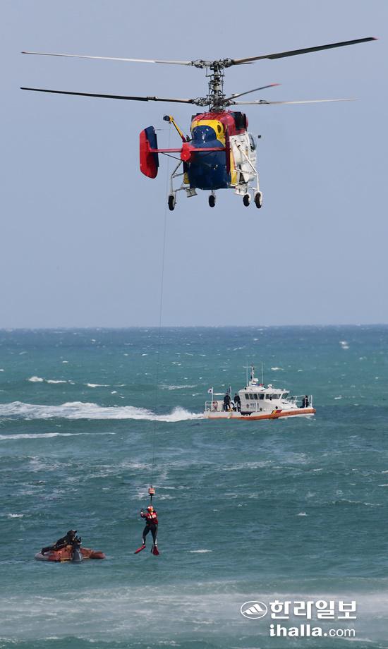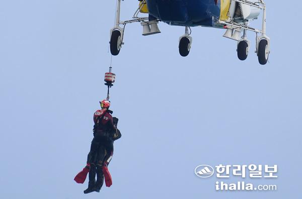 제주해경청 항공단이 25일 서귀포시 안덕면 사계해안도로와 형제섬 사이 해상에서 전복된 보트에 타고 있던 승선원을 헬기로 구조하고 있다. 강희만기자