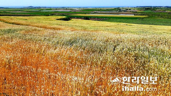 24일 서귀포시 대정읍 하모리 일대 보리밭이 황금빛으로 물들며 장관을 이루고 있다. 강희만기자