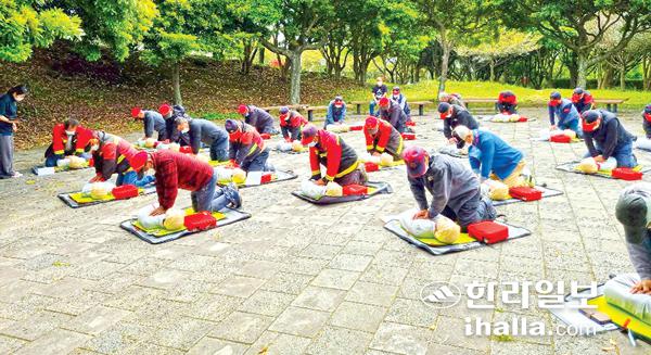 서귀포시는 지난 22일 신시가지 시민공원에서 산불전문예방진화대원 60명을 대상으로 심폐소생술 교육을 실시했다.