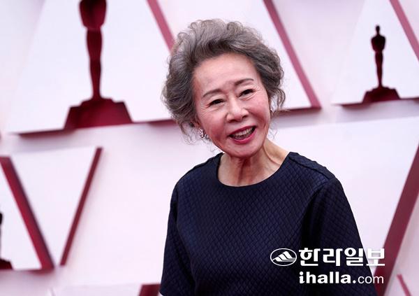 25일(현지시간) 미국 캘리포니아주 로스앤젤레스(LA) 유니언 스테이션에서 열린 제93회 아카데미상 시상식에 배우 윤여정(74)이 검은 드레스를 입고 참석해 레드카펫을 밟고 있다. 그는 한국 배우 최초로 아카데미상 여우조연상을 수상했다. 연합뉴스