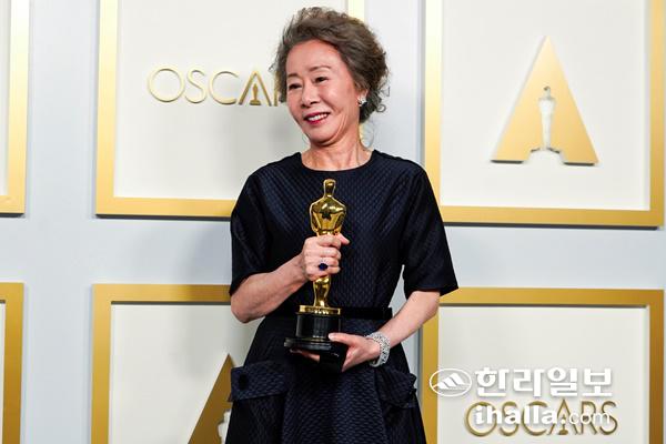 25일(현지시간) '미나리' 여우조연상 수상자인 윤여정이 오스카 시상식 기자실에서 포즈를 취하고 있다. 연합뉴스