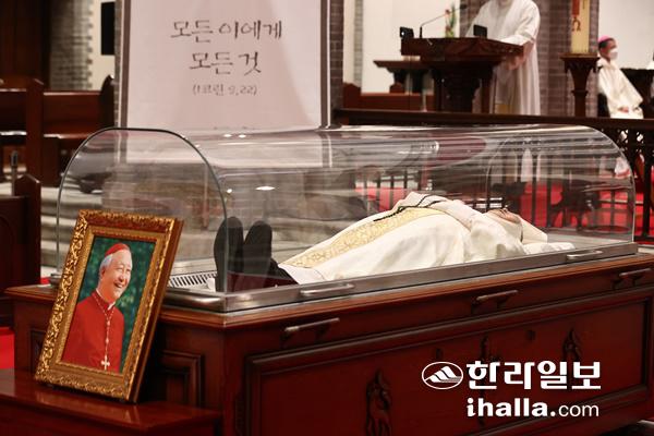 정진석 추기경이 선종한 지 하루가 지난 28일 새벽 명동성당에서 정 추기경 시신이 유리관에 안치된 가운데 선종미사가 진행되고 있다. 연합뉴스