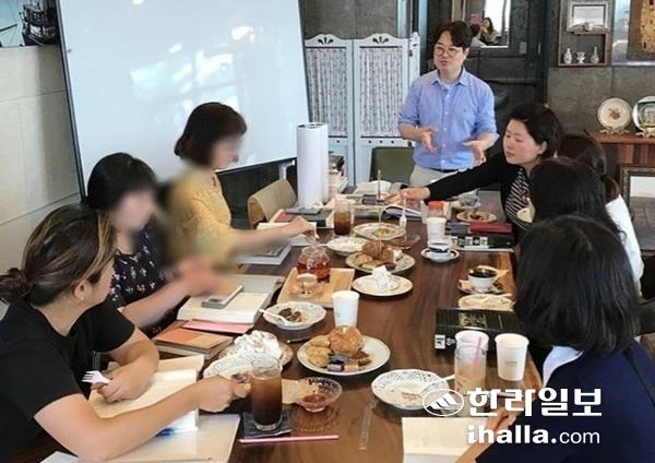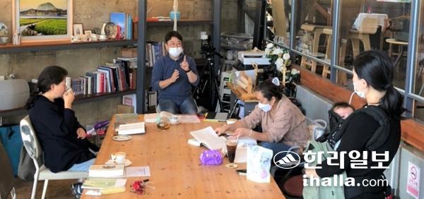 신은실 서귀포시민의 책읽기 위원과 연서단 회원들이 '내 안의 역사'를 읽고 그에 대한 이야기를 나누고 있다. 사진=서귀포시민의책읽기위원회 제공