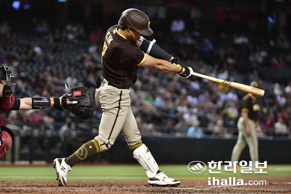 5회 역전의 물꼬를 튼 우중간 적시타 치는 김하성. 연합뉴스