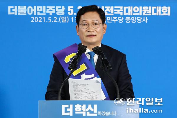 더불어민주당 당 대표에 출마한 송영길 후보가 2일 서울 여의도 중앙당사에서 열린 2021 임시전국대의원대회에서 정견을 발표하고 있다. 연합뉴스