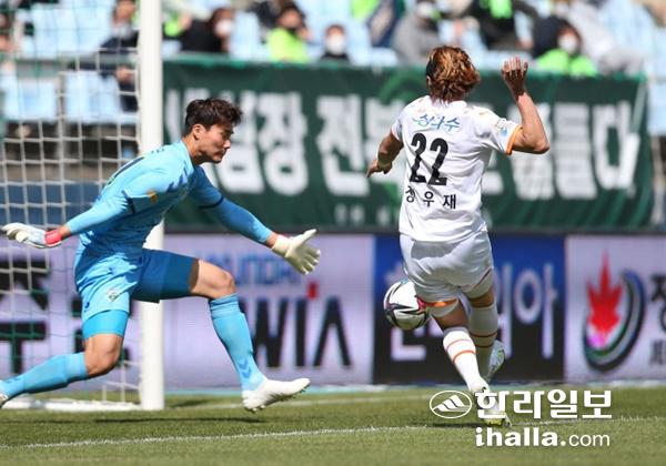 2일 전주월드컵경기장에서 열린 전북현대와의 경기에서 선제골을 넣고 있는 제주 정우재. 제주 제공