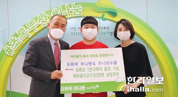꼬마 유튜버 쭈니맨(탐라중 1학년, 권준)은 지난달 30일 초록우산 어린이재단 제주지역본부(본부장 김희석)를 통해 사랑의 돼지고기 50만원 상당을 후원했다.