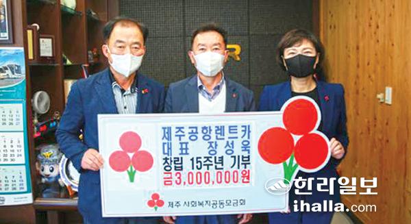 제주공항렌트카(대표 장성욱)는 지난달 30일 제주공항렌트카 사무실에서 창립 15주년을 기념해 어려운 이웃을 돕는 데 써달라며 제주사회복지공동모금회(회장 김남식)에 이웃사랑 성금 300만원을 기탁했다.
