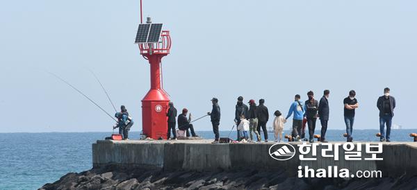 일단의 낚시인들이 3일 제주시 애월읍 고내방파제에서 낚시를 즐기고 있다. 방파제를 찾은 관광객들이 낚시꾼과 바다 절경을 감상하며 모처럼의 휴식을 즐기고 있다. 이상국기자