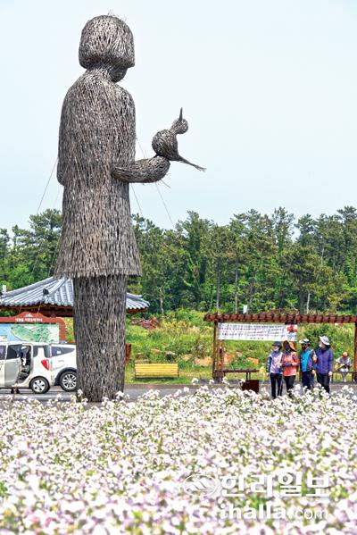 일제강점기 아픈 역사의 흔적을 품고 있는 서귀포시 대정읍 알뜨르비행장을 찾은 관광객들이 입구에 설치된 최평곤 작가의 대나무 조형물 '파랑새'를 배경으로 또 다른 제주를 만나고 있다. 이상국기자