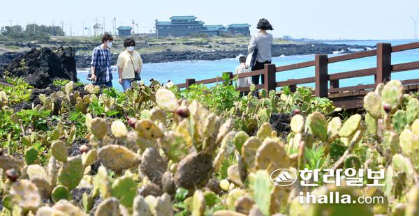 3일 제주시 한림읍 선인장 마을을 찾은 관광객들이 봄 바다와 어우러진 선인장을 구경하고 있다. 이상국기자