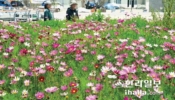 4일 제주시 추자면 대서리 화단에 코스모스가 화사한 색깔로 활짝 피어나 섬을 찾은 탐방객들의 눈길을 끌고 있다. 강희만기자