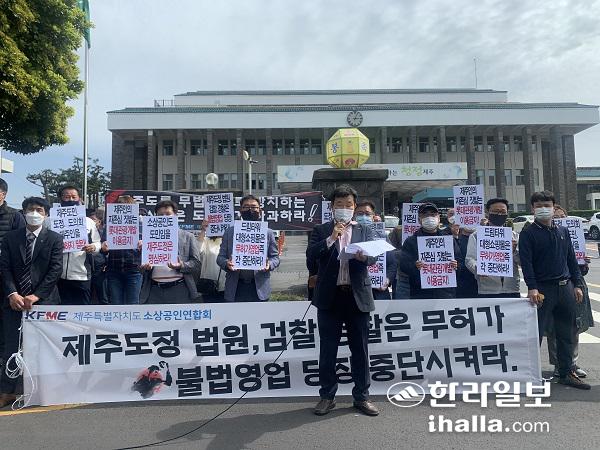 제주도소상공인연합회는 6일 제주도청 앞에서 기자회견을 열고 "롯데관광개발주식회사는 무허가 불법으로 영업을 자행하고 있는 드림타워 쇼핑몰 운영을 즉시 중단하라"고 촉구했다. 송은범기자