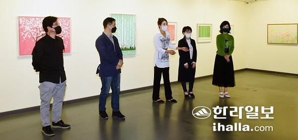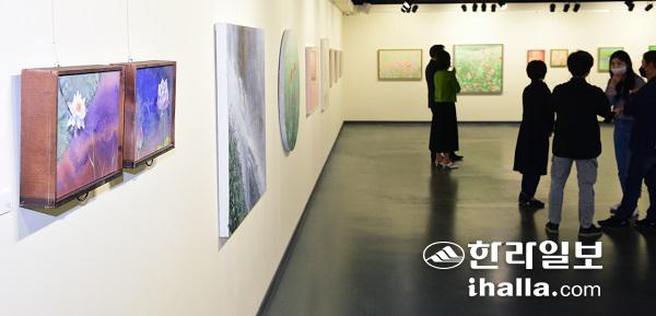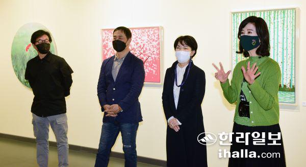 서울에서 활동하는 중견작가 6인의 개성이 드러나는 작품을 한 눈에 볼 수 있는 '꽃나들이 봄'전이 한라일보 1층 갤러리 ED(이디)에서 열리고 있다. 6일 열린 초대전 오프닝 행사에는 (사진 왼쪽부터)이강화, 이수동, 이영수, 최지윤 작가가 참석했다. 이상국기자