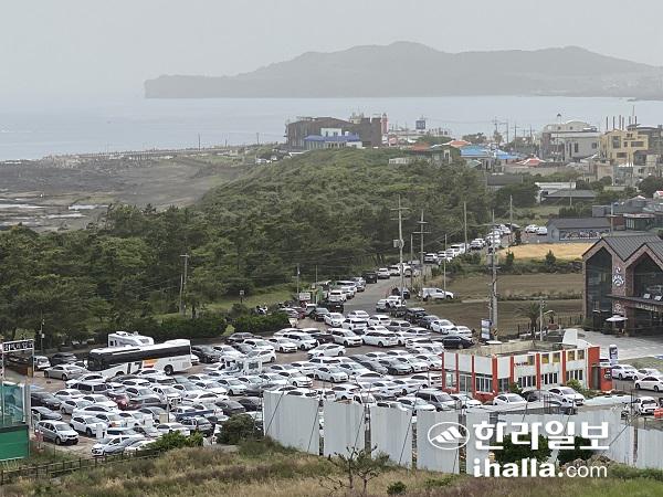 어버이날인 지난 8일 서귀포시 안덕면 용머리 공영주차장에 빼곡히 주차된 렌터카 차량. 이태윤기자