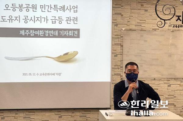 홍영철 제주참여환경연대 대표가 12일 제주시 이도2동 교육문화카페 '자람'에서 제주시 오등봉·중부공원 민간 특례사업 중단을 촉구하는 기자회견을 하고 있다. 연합뉴스