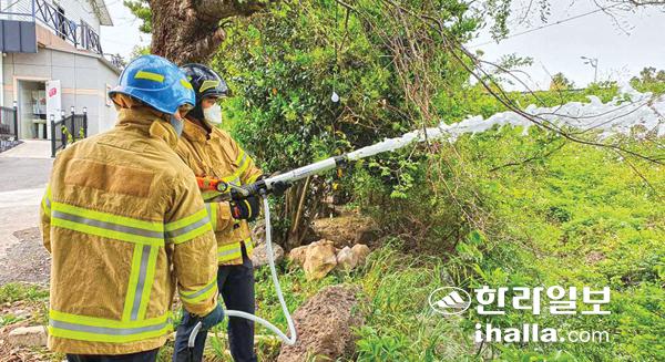 제주소방서 노형119센터(센터장 정경만)는 지난 11일 신규 화재진압장비(폼이젝터)를 활용한 화재진압 훈련을 실시했다.