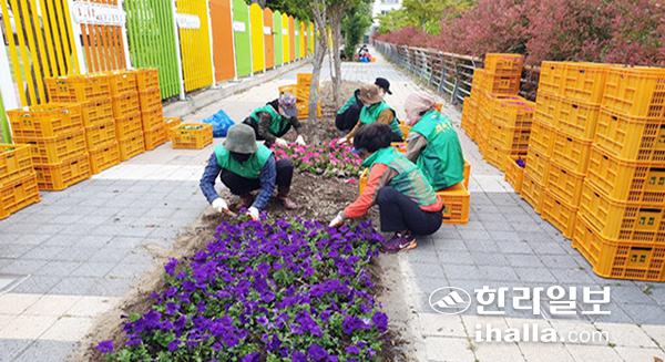 제주시 이도2동 주민센터(동장 박창현)와 새마을부녀회(회장 고인숙)는 지난 11일 오전 남광초등학교 주변에 꽃피는 거리조성을 위한 페튜니아꽃 3000여본을 식재하였다.