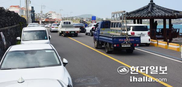 제주시 애월읍 구엄리 해안도로가 불법 주정차 차량들로 몸살을 앓고 있다. 12일 해안도로 자전거길과 갓길에 주차된 차량들을 피해 교행하는 차량들이 중앙선을 넘어 주행하는 등 아찔한 상황이 계속됐다. 이상국기자