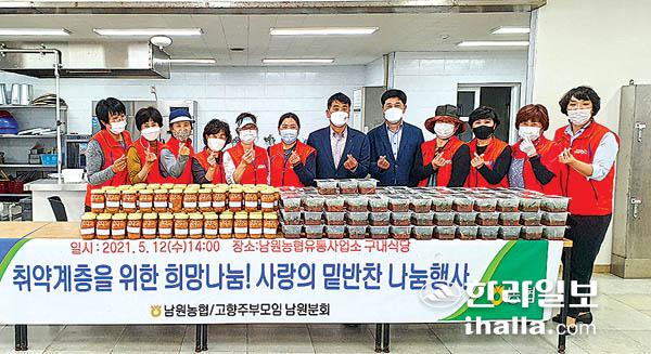 남원농협 고향주부모임(회장 김정희)은 지난 12일 남원농협 유통사업소에서 열무김치와 된장양념장을 담가 취약계층 120가정에 전달했다.