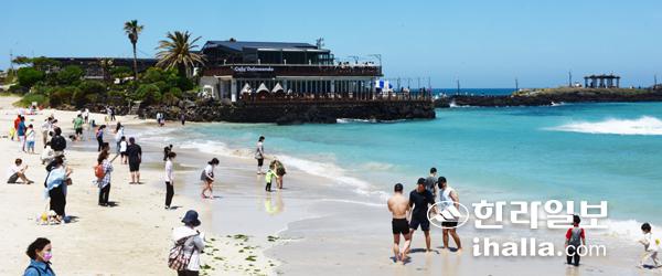 초여름 날씨처럼 기온이 치솟은 13일 제주시 조천읍 함덕해수욕장을 찾은 많은 도민·관광객들이 해변을 거닐거나 물에 발을 담그면서 더위를 식히고 있다. 이상국기자