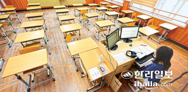 코로나19 확진자가 늘어나면서 도내 모든 고등학교가 원격수업으로 전환된 가운데, 스승의날을 이틀 앞둔 13일 제주 제일고등학교에서 한 선생님이 홀로 수업을 진행하고 있다. 이상국기자