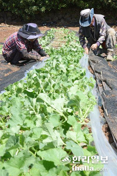 맑고 쾌청한 날씨가 이어진 13일 제주시 조천읍 한 참외밭에서 농민들이 손보기 작업으로 분주한 시간을 보내고 있다. 이상국기자