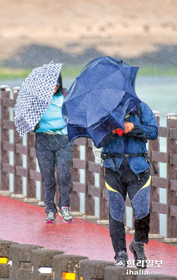 강한 바람과 함께 비가 내린 16일 제주시 구좌읍 하도리 해안에서 '올레꾼'들이 비바람을 뚫고 걸어가고 있다. 강희만기자