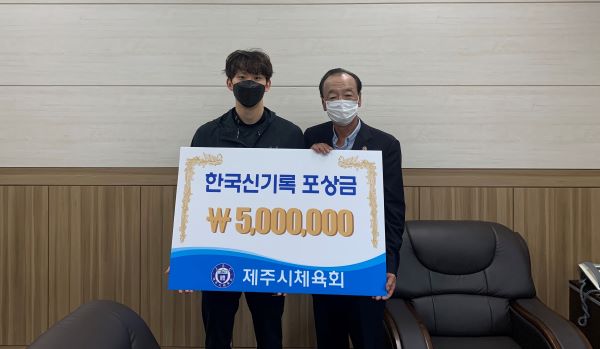 제주시체육회는 17일 조성재 선수(제주시청)에게 한국신기록 포상금 500만원을 전달했다. 사진=제주시체육회 제공
