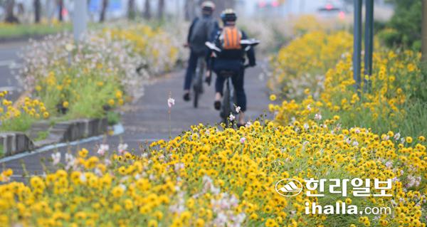 높은 기온과 함께 며칠 비가 오락가락 하더니 노란 금계국이 활짝 피어났다. 17일 서귀포시 대정읍 일주도로를 지나는 라이더들이 신기한 듯 금계국을 바라보고 있다. 금계국은 국화과의 한해살이 또는 두해살이 풀이다. 강희만기자