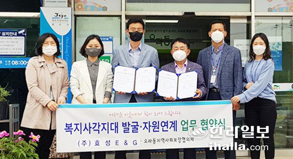 제주시 오라동지역사회보장협의체(민간위원장 양국남)와 (주)효성E&G(대표이사 박진우)는 지난 14일 저소득 가구에 가전제품 후원 및 수리·교체 등 전자서비스 제공을 위한 복지자원 업무 협약을 체결했다.